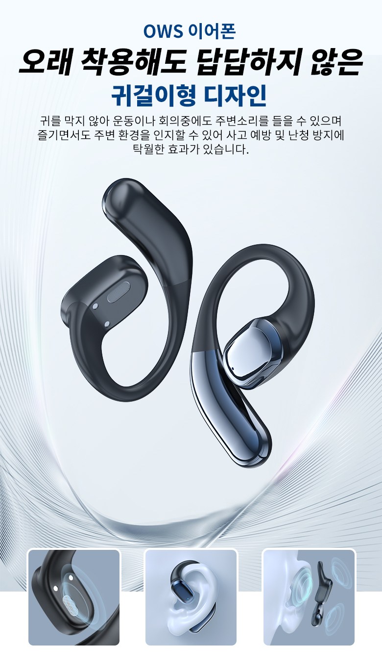 단순히 ‘무선 이어폰’이 아니라, 귀를 편안하게 감싸며 자연스러운 소리를 재현하는 오픈형 구조, 그리고 귀걸이형 디자인의 안정감을 더해, 새로운 청취 경험을 선사합니다. 🎧