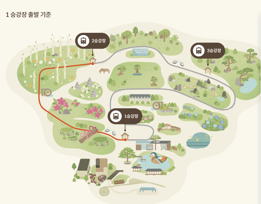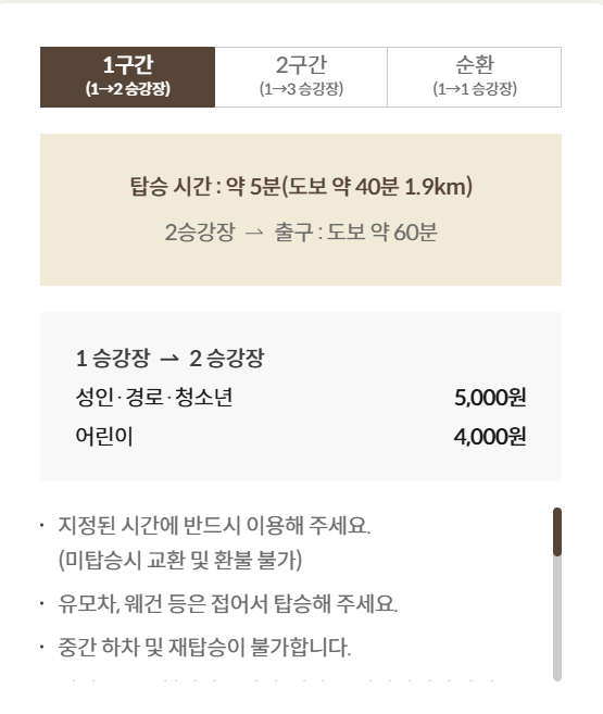 모노레일은 중간에 하차 없이 정상 부근까지 올라가며, 내려올 땐 산책로를 따라 도보로 내려오거나 다시 모노레일을 이용할 수도 있어요.