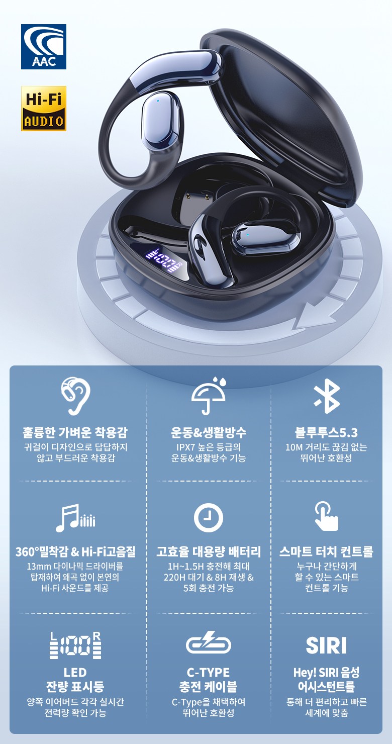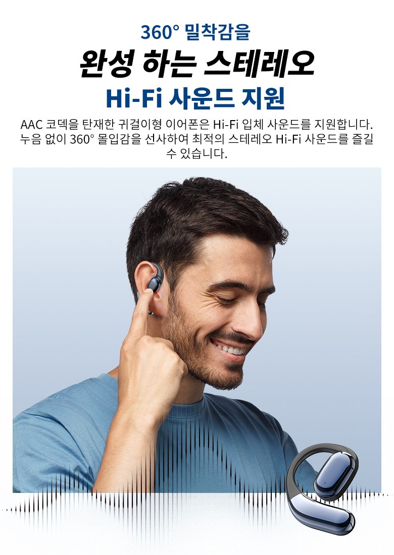 단순히 ‘무선 이어폰’이 아니라, 귀를 편안하게 감싸며 자연스러운 소리를 재현하는 오픈형 구조, 그리고 귀걸이형 디자인의 안정감을 더해, 새로운 청취 경험을 선사합니다. 🎧